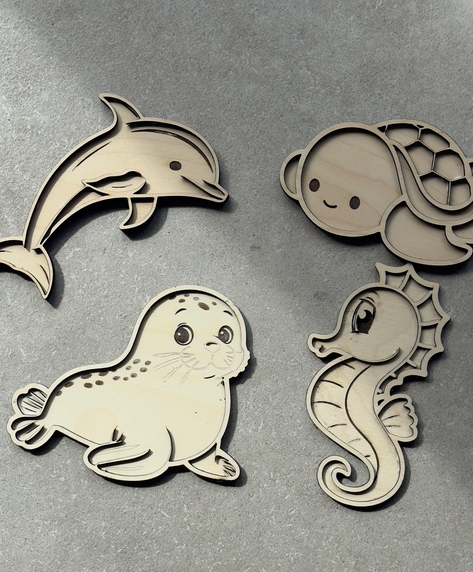 4-delige houten figuren met allerlei elementen die je tegenkomt in het zee leven, gemaakt van triplex hout.